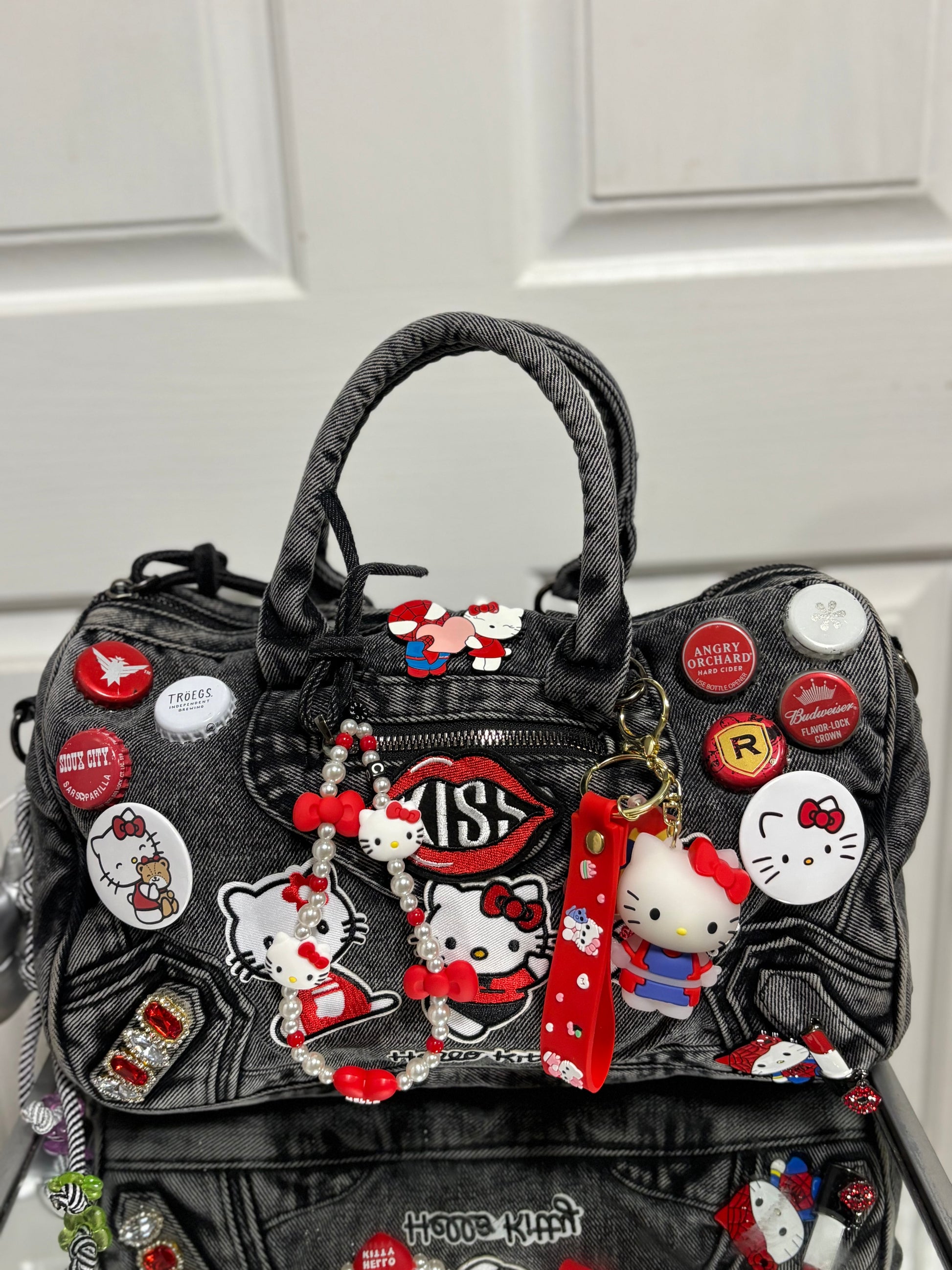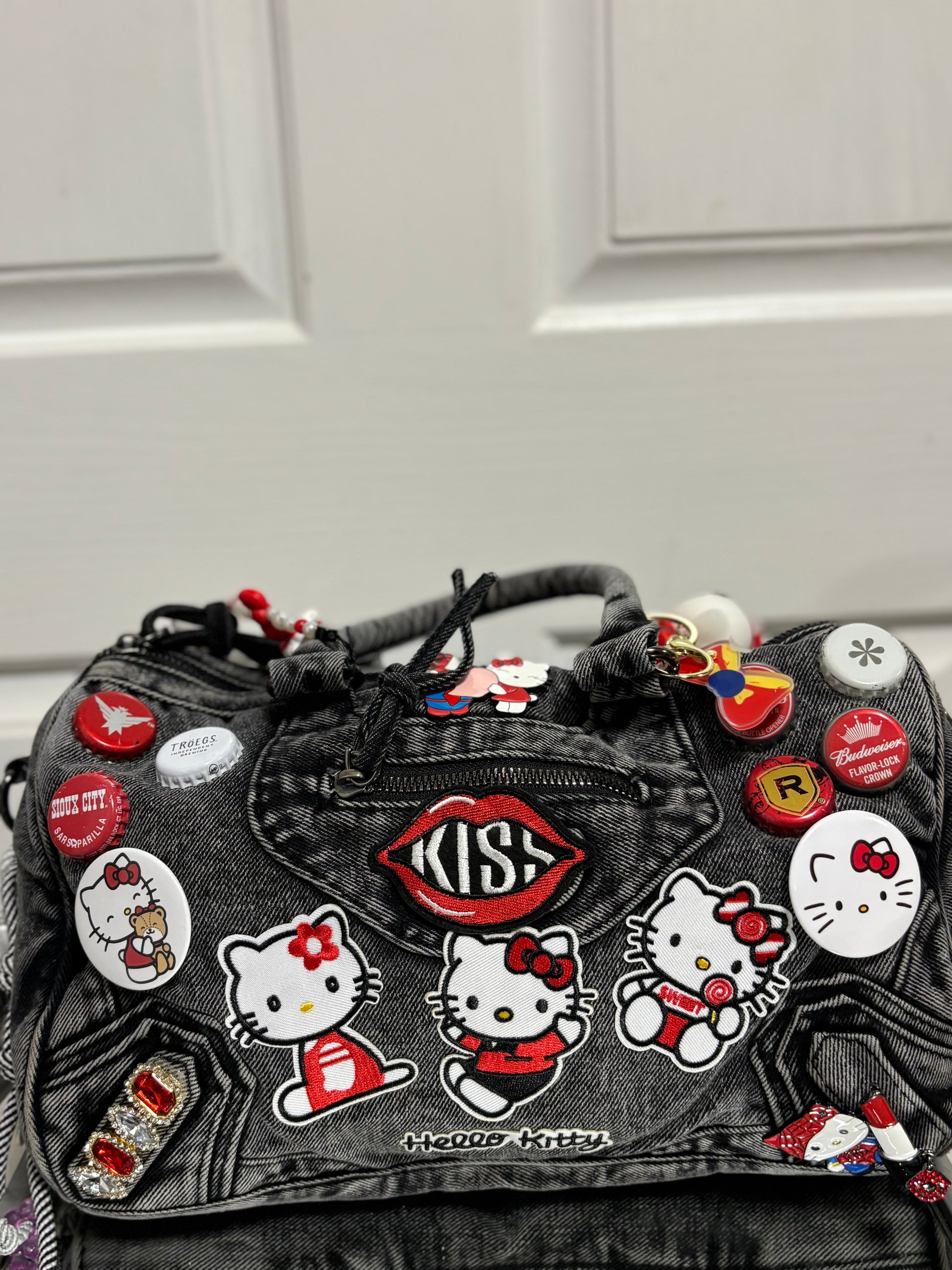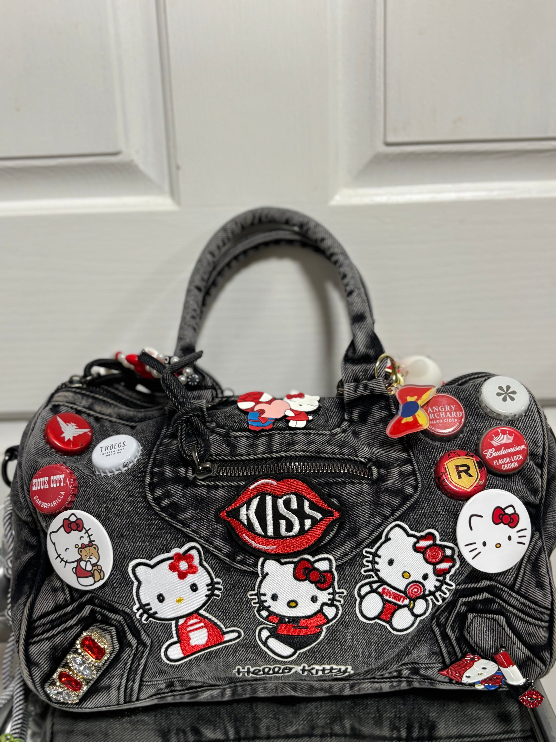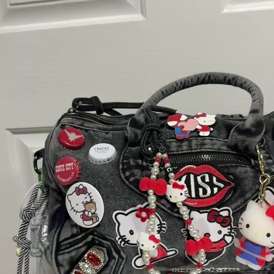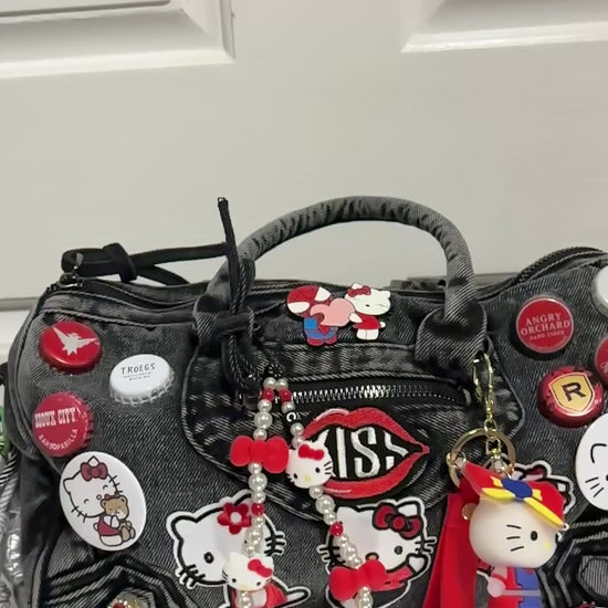 Built on a sturdy denim base, this bag is covered in hand-picked patches, charms, and accents that give it that signature “junkie” look—loud, playful, and unapologetic. The deep red and black tones bring out the rebellious side of Hello Kitty, making this the ultimate statement piece for anyone who dares to stand out.