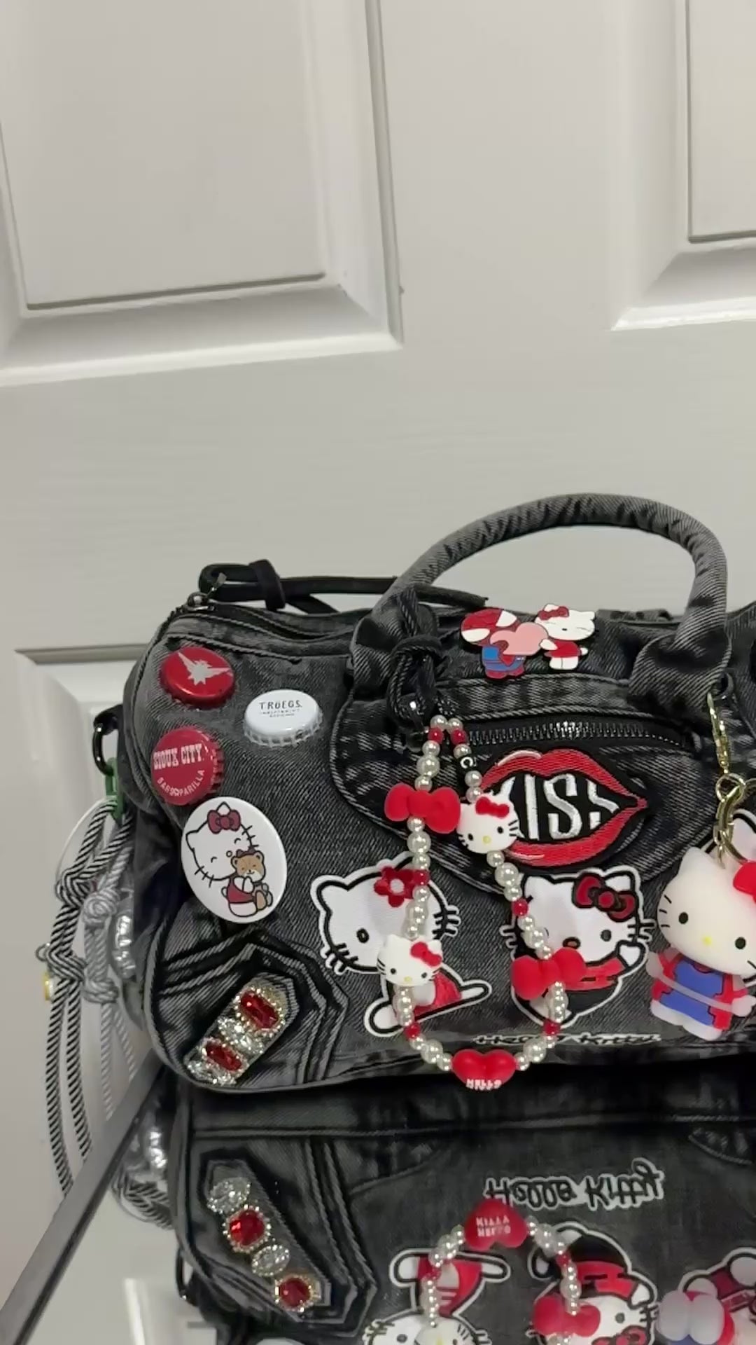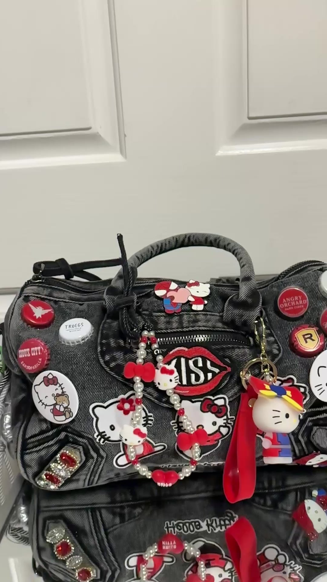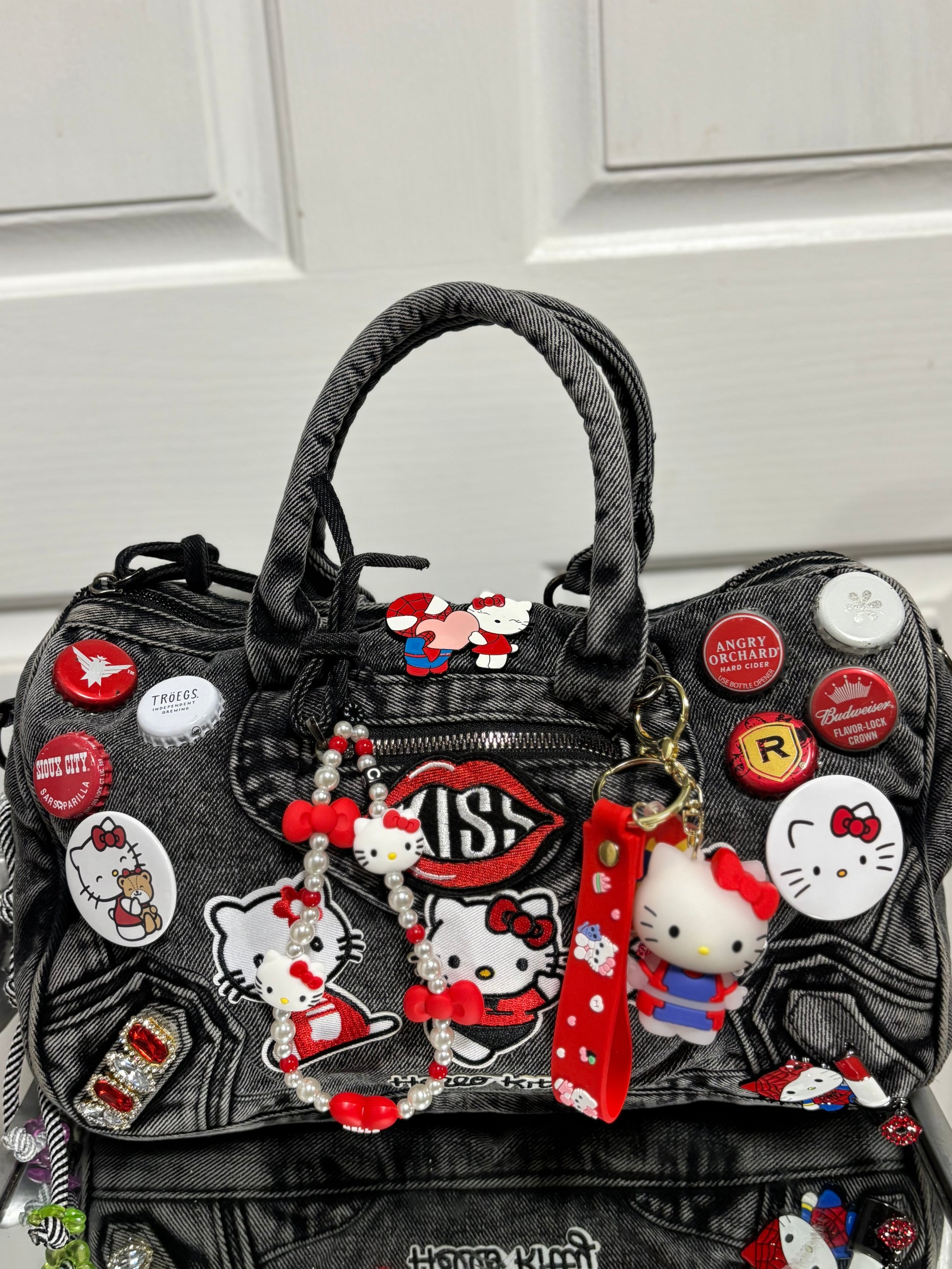 Built on a sturdy denim base, this bag is covered in hand-picked patches, charms, and accents that give it that signature “junkie” look—loud, playful, and unapologetic. The deep red and black tones bring out the rebellious side of Hello Kitty, making this the ultimate statement piece for anyone who dares to stand out.