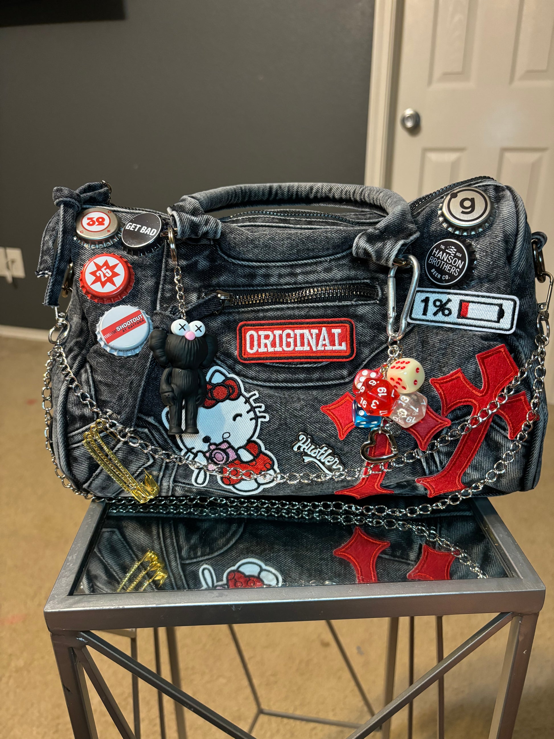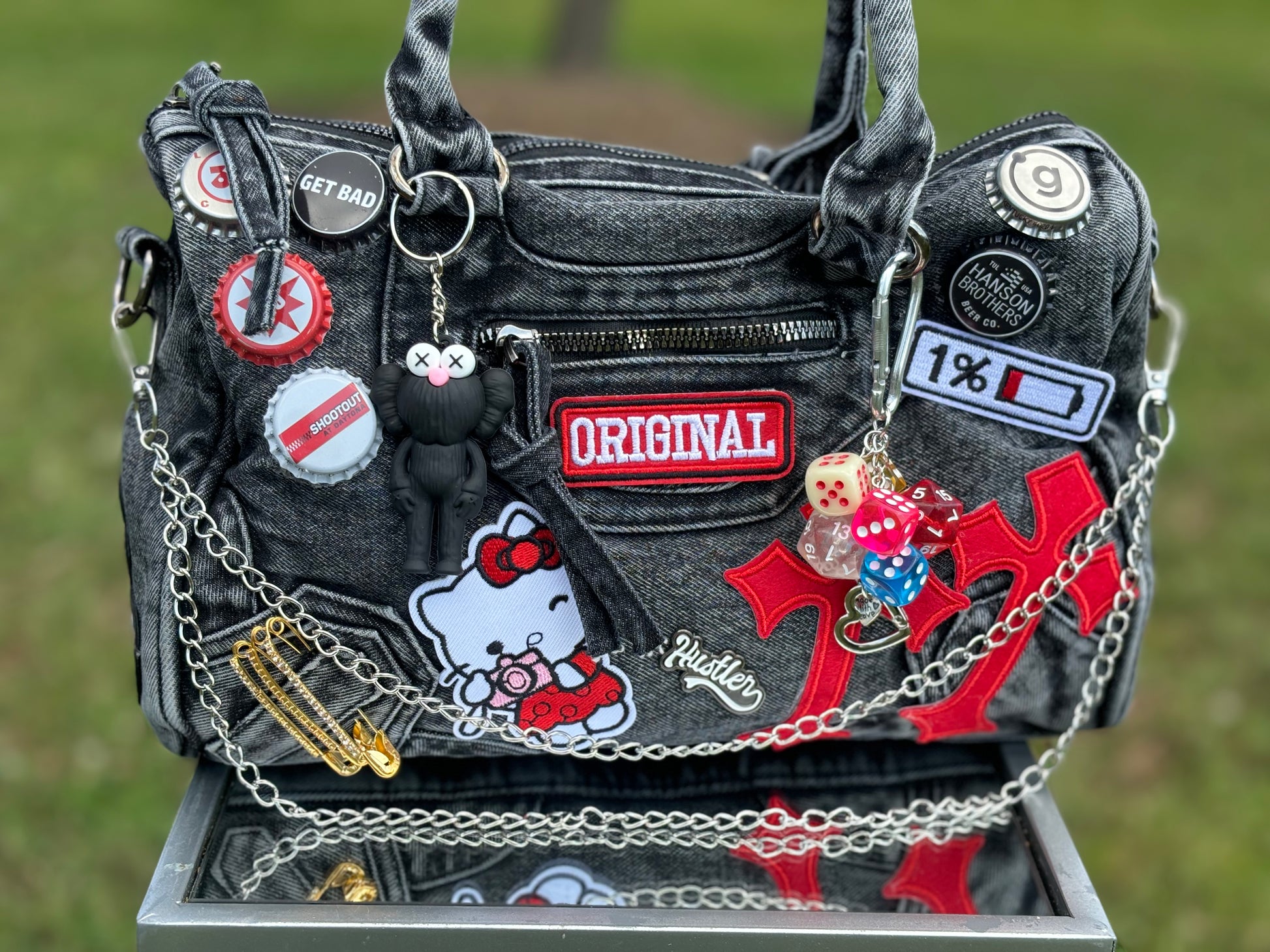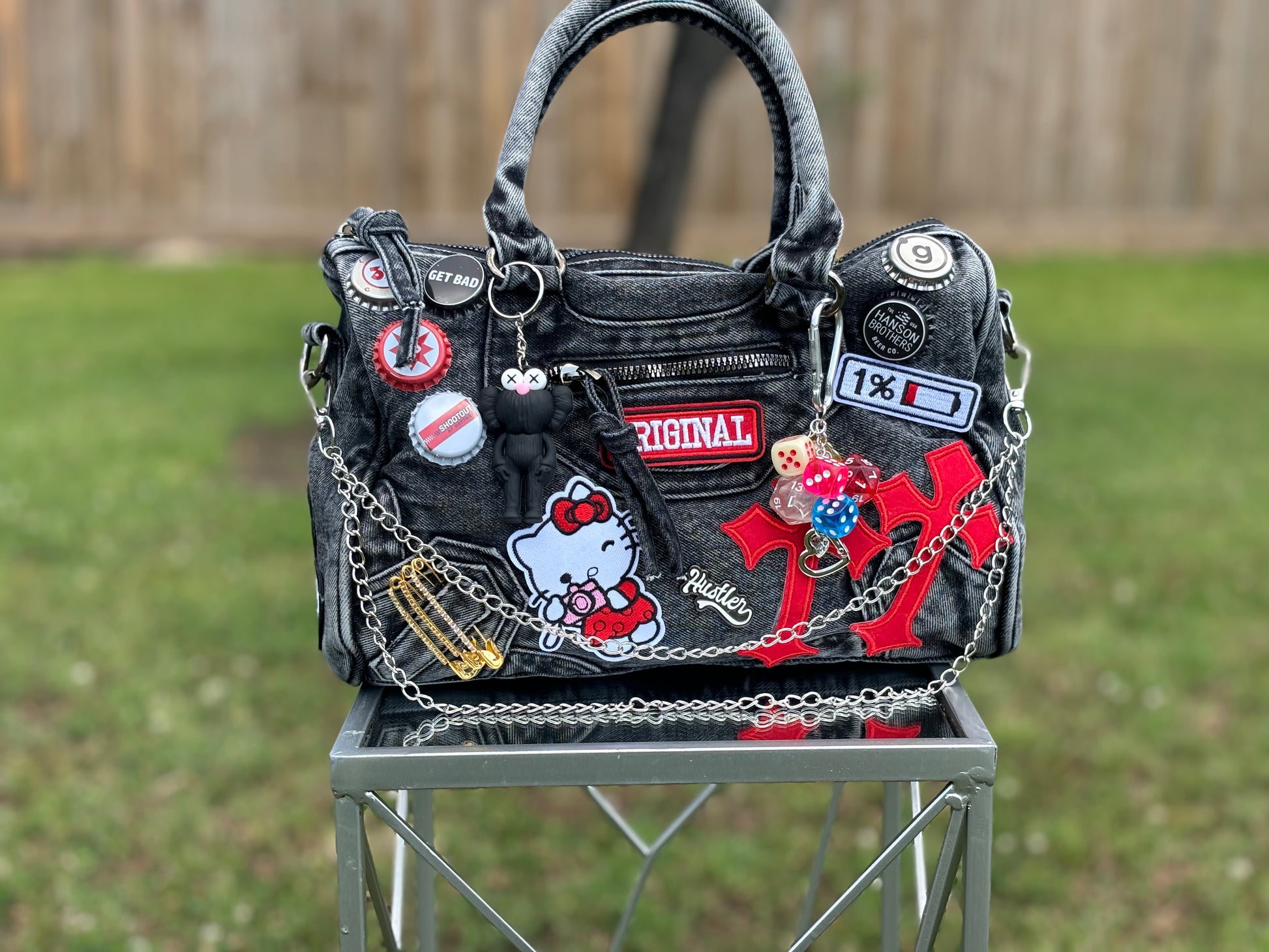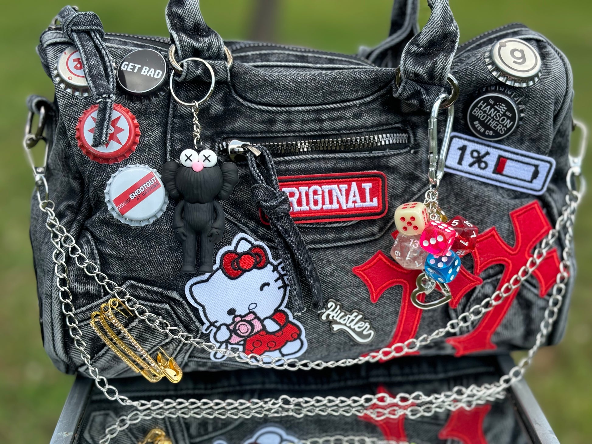 For the girls who run the show 😼✨ The Bossy Kitty Junkie Bag is all about power, attitude, and unapologetic style. Taking the sweetness of Hello Kitty and giving her a boss-level upgrade, this custom denim bag is decked out with fierce patches, charms, and details that make it impossible to ignore.